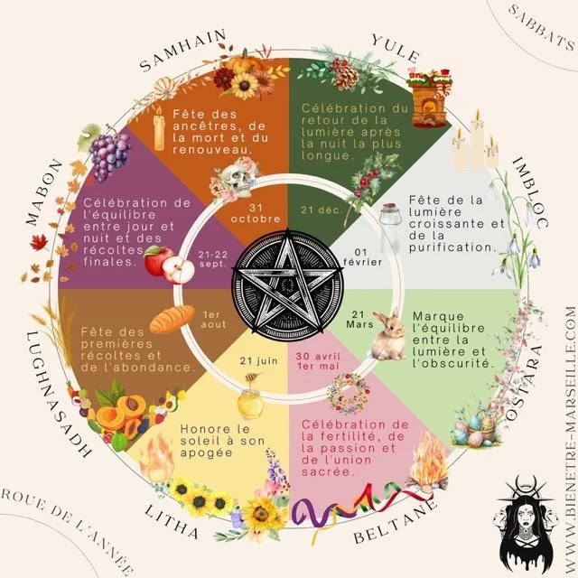 Une présentation claire et inspirante de chaque Sabbat, avec ses dates, ses significations, et des idées de célébrations.