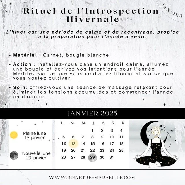 Rituel : Allume une bougie pour symboliser le retour de la lumière. Fais un bilan de l’année écoulée en notant ce que tu souhaites libérer et ce que tu veux accueillir.