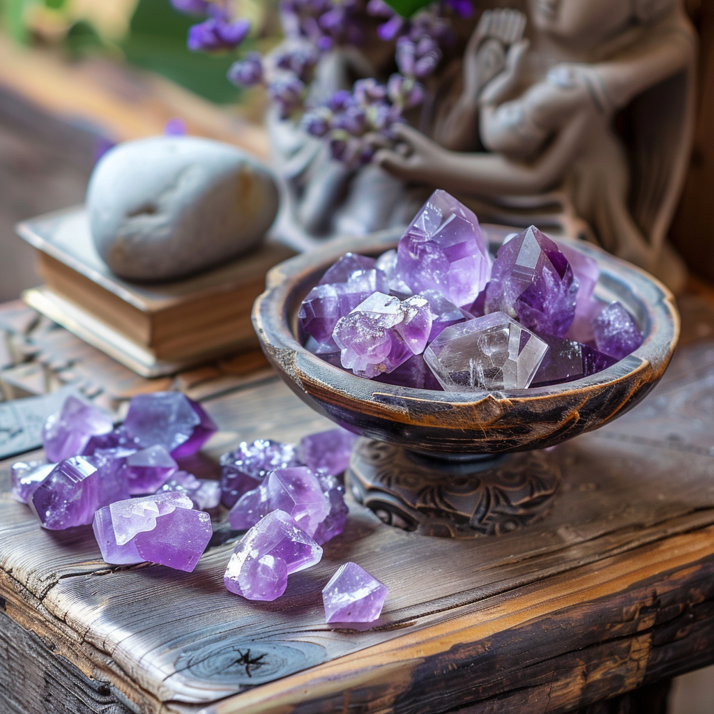 Améthyste : Utilisée pour calmer l'esprit et favoriser le sommeil. Ses vibrations douces peuvent aider à réduire l'anxiété et le stress.